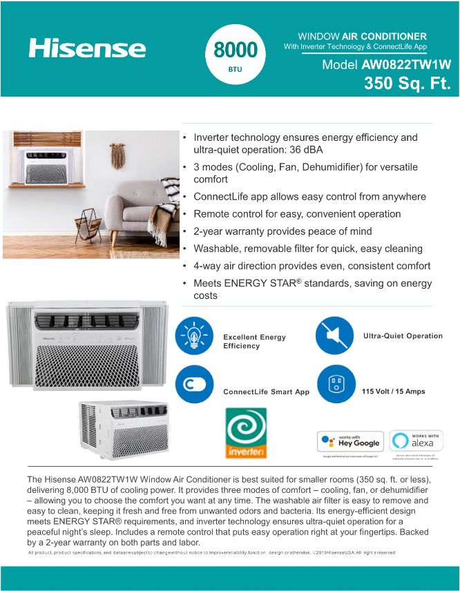 The Hisense AW0822TW1W Window Air Conditioner with inverter technology, best suited for smaller rooms (350 sq. ft. or less) with 8,000 BTU of cooling power, is packed with various efficient, easy to use features. Hisense inverter technology saves energy and maintains stable temperature at desired level by varying rotation speed of compressor. E-star certified air conditioner can reduce energy consumption, which in turn, helps to save money. With ConnectLife app on your mobile phone, you can turn on/off your air conditioner or adjust the setting wherever, whenever. The maintenance is simple thanks to the washable and removable filter.