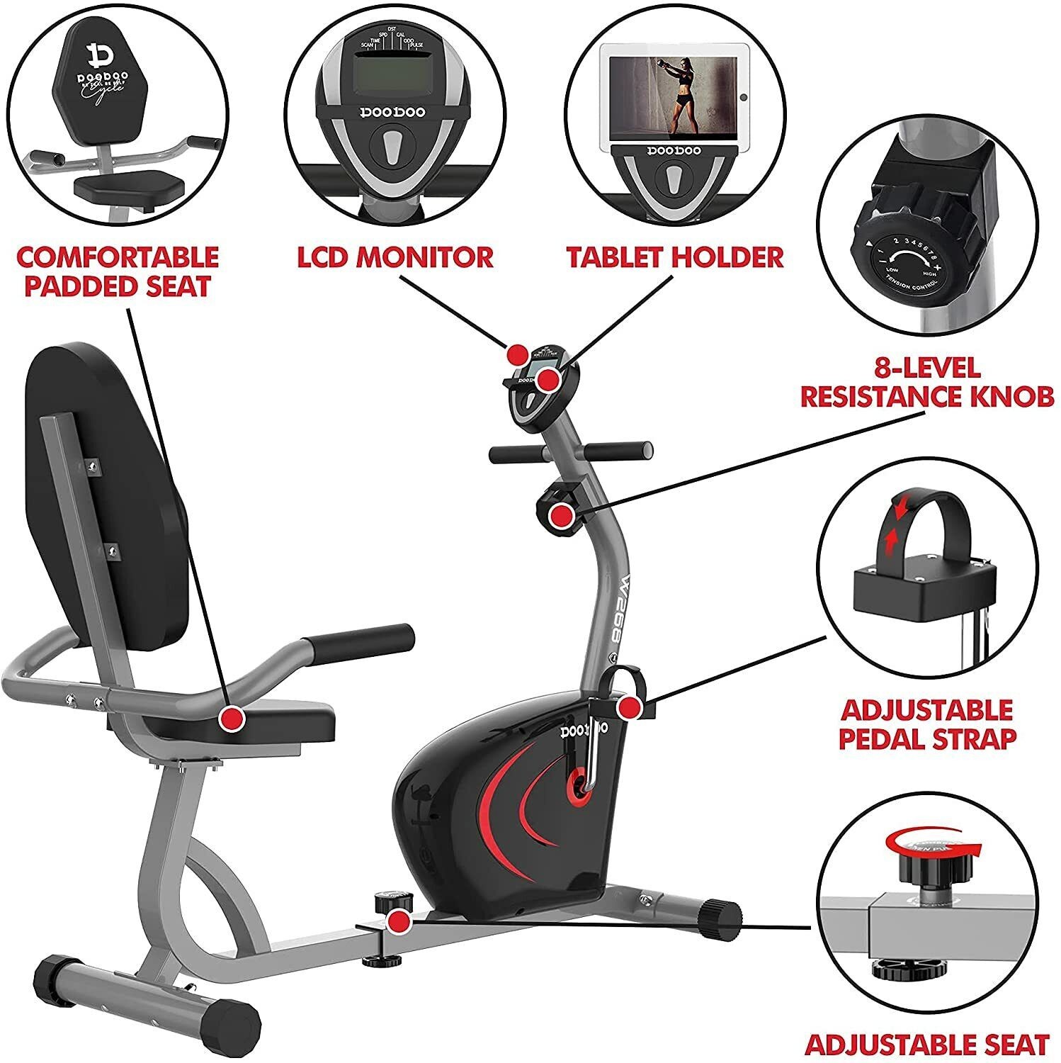 EIGHT RESISTANCE LEVELS, COMFORTABLE PADDED SEAT, Easy To Move, Super Quiet Magnetic Resistance, Comfortable Seat & Safe Handrail, Stable Length Adjustment, Adjustable Padded Seat & Safe Handrail, Quiet 8 Level Magnetic Resistance, LCD Monitor & iPad Holder, Big Comfortable Seat & Safe Handrail, 8 Levels Magnetic Resistance, LCD Monitor with Phone Holder, 7 Positions Seat Adjustment, Adjustable Non-slip Pedals, Adjustable Seat, Body-Fat Analysis, Calorie Monitor, LCD-Display, Magnetic Brake System
